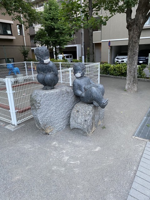 公園の銅像もマスク!